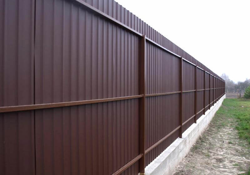 Сами лаги собираются из профильных труб, закрепленных на столбах. Обычно трубы крепятся при помощи сварки, реже скручиваются болтами. Для возведения забора устанавливают два или три ряда лагов, на которые и закрепляют листы «профнастила» или штакетника. По верху забора обычно устанавливается специальная заборная планка, придающая конструкции жесткость.