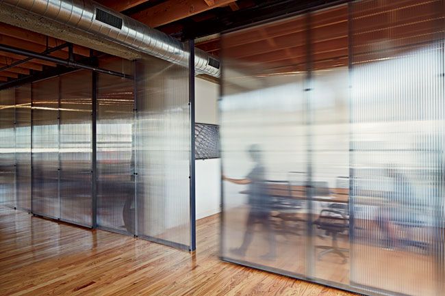 Перегородки из поликарбоната часто используются в помещениях самого разного назначения. Материал одинаково хорошо подходит для ограниченных в пространстве офисов, небольших студий и просторных загородных домов.